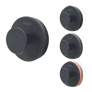 De Tiger Haak Urban Groot Zwart is uitgevoerd in de kleur mat zwart en wordt geleverd met twee decorringen. De decorringen, in de kleur koper en grijs, maken het mogelijk een subtiel kleuraccent toe te voegen. Het is ook mogelijk de haak zonder de decorring te monteren waardoor het zeer eenvoudig is om het product aan de gewenste stijl aan te passen. Bij de montage van het artikel wordt gebruik gemaakt van een muurplaatje waardoor de bijgeleverde bevestigingsmaterialen uit het zicht verdwijnen. De Urban serie bevat tevens een kleine haak voorzien van dubbelzijdige tape, maar ook een groot aantal aanvullende accessoires voor de badkamer en toiletruimte. Alle in dezelfde stijl. De artikelen uit de serie zijn ook in de kleur mat wit verkrijgbaar, waarbij natuurlijk ook weer diverse decorringen worden meegeleverd. De haak groot is tevens geschikt voor montage met TigerFix type 1, waarmee accessoires snel en eenvoudig op een gladde, harde ondergrond te bevestigen zijn door middel van een gepatenteerd lijmsysteem. Boren is niet noodzakelijk en de accessoires zijn eenvoudig te verwijderen zonder dat er resten op de ondergrond achterblijven. TigerFix is los verkrijgbaar.