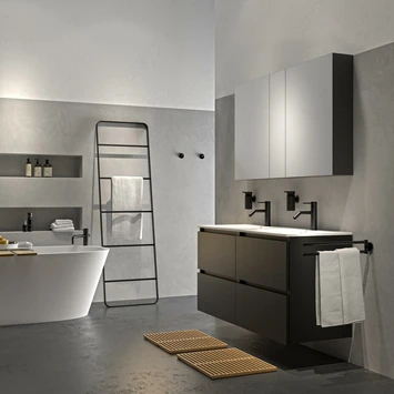 Daarnaast bestaat deze set uit twee matzwarte polybeton wastafels met natuursteen look. Tijdens het ontwerpproces van de waskommen is goed nagedacht over een juiste balans tussen design en functionaliteit. Polybeton wastafels zijn hygiënisch en gemakkelijk in onderhoud. De wastafel heeft twee externe overlopen en 2 kraangaten. Voor het overloopgat wordt een sierring in zowel chroom als zwart meegeleverd waardoor deze altijd mooi aansluit bij je badkameraccessoires.